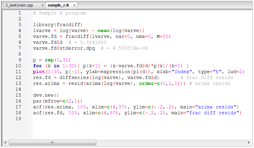 Przykładowy widok kodu R w Code::Blocks: